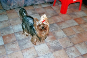 Püppchen, eine Yorkshirehündin, mit einer kleinen geistigen Behinderung. Sie sollte vom Tierarzt in Ettlingen eingeschläfert werden, weil sie bei Erregung mit dem Kopf wackelt wie ein Wackeldackelchen. Außerdem kann sie ab der Mitte ihres Körpers nach hinten die Bewegungen nicht gut koordinieren. Unser Tierarzt meinte, vermutlich Sauerstoffmangel bei der Geburt oder Inzucht.
